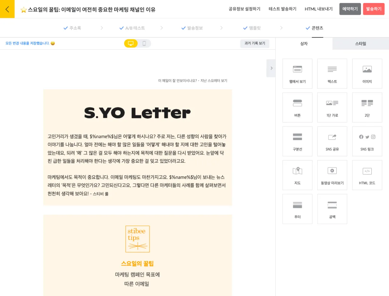 코드 작성이 필요없는 편리한 에디터와 성과를 개선하는 자동 이메일, A/B 테스트, SNS 공유 등의 기능을 제공하기 때문에 뉴스레터나 마케팅 이메일 발송 업무의 효율과 성과를 모두 높일 수있습니다.